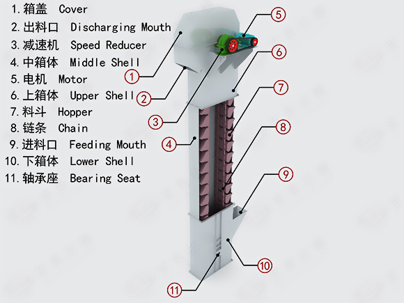 斗式提升機是利用均勻固接于無端牽引構件上的一系列料斗,豎向提升物料的連續輸送機械。分為環鏈、板鏈和皮帶三種。