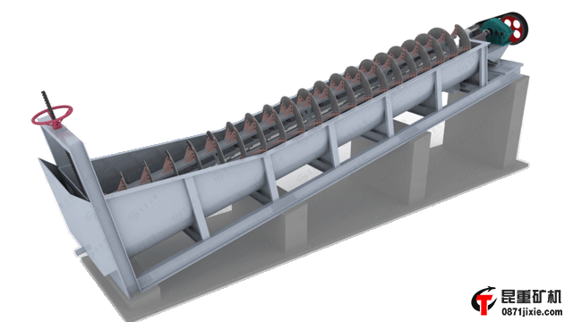 沉沒式螺旋分級機(jī)在溢流堰端有4至5個(gè)螺旋葉,全部沉沒在礦漿中。該種分級機(jī)沉降區(qū)面積較大,分級池深,螺旋的攪動(dòng)對礦漿表面影響較小。所以分級面平穩(wěn),溢流量大而細(xì)。沉沒式螺旋分級機(jī)是借助于固體粒大小不同、比重不同,因而在液體中的沉降速度不同的原理,細(xì)礦粒浮游在水中成溢流出,粗礦粒沉于槽底,由螺旋推向上部排出,來進(jìn)行機(jī)械分級的一種分級設(shè)備。通過螺旋低速轉(zhuǎn)動(dòng),對礦漿起攪拌作用使細(xì)顆粒懸浮到上面,流到溢流堰處溢出,粗顆粒沉到槽底,由螺旋輸送到排料口作為返砂排出。