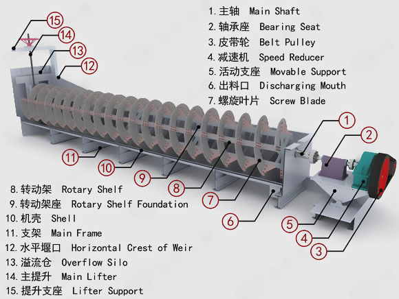 螺旋分級機(jī)具體界定為溢流堰位置高于螺旋軸下端的軸承中心,但低于溢流端螺旋的上緣的為高堰式螺旋分級機(jī),它具有一定的沉降區(qū)域,適用于粗粒分級,可以獲得大于0.83至0.15毫米的溢流粒度;溢流堰低于溢流端軸承中心的為低堰式螺旋分級機(jī),它沉降區(qū)面積小,溢流生產(chǎn)能力低,通常不用于分級作業(yè),而用來沖洗礦砂進(jìn)行脫泥;溢流端的整個(gè)螺旋都浸沒在沉降區(qū)的液面下的為沉沒式螺旋分級機(jī),其沉降區(qū)具有較大的面積和深度,適用于細(xì)粒分級,可以獲得小于0.15至0.07mm的溢流粒度。
