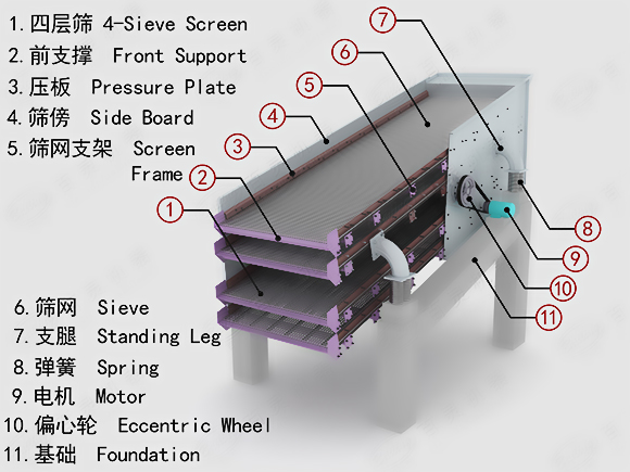 圓振動(dòng)篩工作時(shí),電動(dòng)機(jī)經(jīng)傳動(dòng)器使激振器偏心塊產(chǎn)生高速旋轉(zhuǎn)。運(yùn)轉(zhuǎn)的偏心塊產(chǎn)生很大的離心力,激發(fā)篩箱產(chǎn)生一定振幅的圓運(yùn)動(dòng),篩上物料在傾斜的篩面上受到篩箱傳給的沖量而產(chǎn)生連續(xù)的拋擲運(yùn)動(dòng),物料與篩面相遇的過程中使小于篩孔的顆粒透篩,從而實(shí)現(xiàn)分級(jí)。